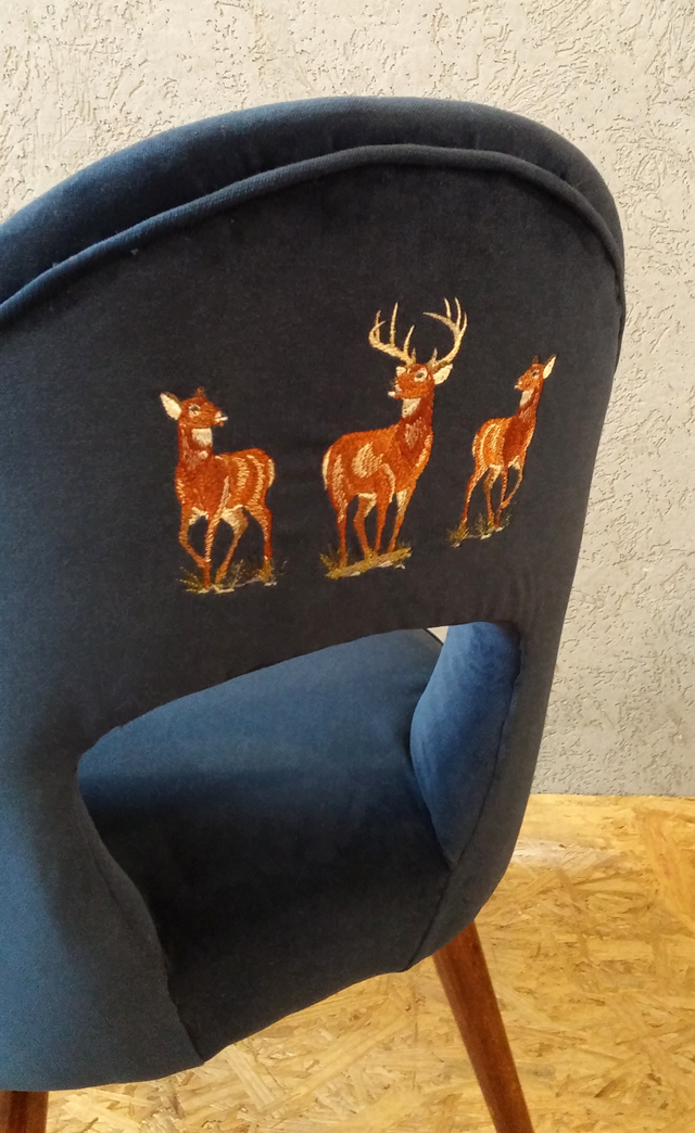 ואני חוזרת לכסאות של מיכל, שהגיעו אלי לסטודיו במצב וינטאג'י אותנטי, עם הבד הישן והמראה העייף, כשבליבה של מיכל משאלה אחת - לקחת את הבד החדש לרקמה ממוחשבת ולרקום עליו איילים ואווזים.