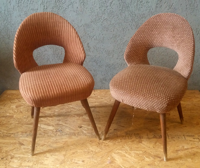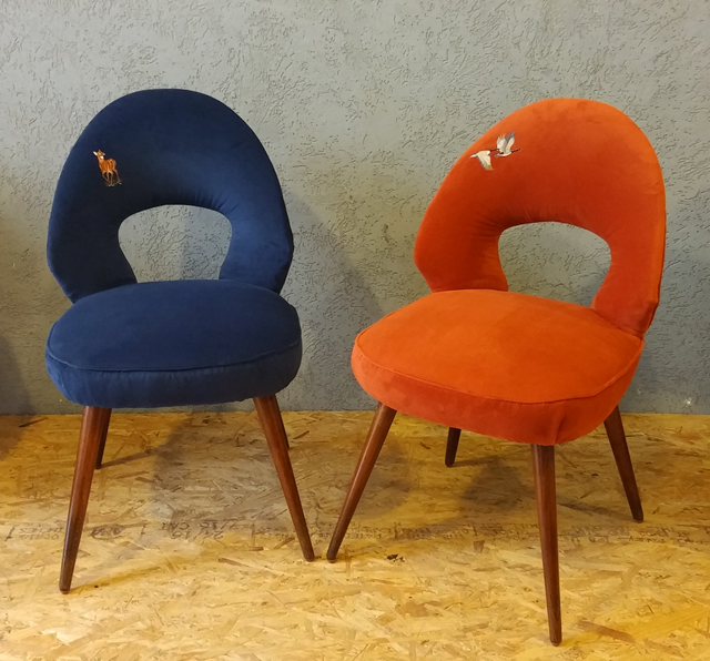 אלה כסאות וינטאג' קטנים, קצת נמוכים, לא מאוד שימושיים אבל מאוד מאוד יפים בצורתם העגולה. ולכן, הדבר הכי טוב שניתן לעשות איתם, לדעתי, זה לעוף על הריפוד שלהם, לתת דרור למשאלות הלב. בדיוק מה שמיכל עשתה.